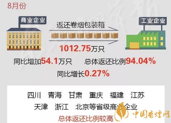通報顯示,8月份,行業(yè)商業(yè)企業(yè)共向工業(yè)企業(yè)返還卷煙包裝箱1012.75萬只(不含重點品牌非毗鄰省份返還量,下同),同比增加54.1萬只,總體返還比例為94.04%,同比增長0.27個百分點;