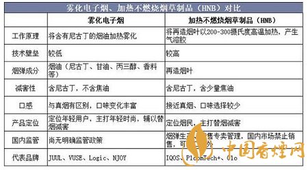 新型煙草是一種具備減害效果的尼古丁傳遞系統(tǒng),其煙氣中的有害物質(zhì),如焦油、一氧化碳等,含量遠(yuǎn)低于傳統(tǒng)卷煙。新型煙草可分為霧化電子煙、加熱不燃燒煙草制品(HeatNotBurning,HNB)兩大類,其中霧化電子煙又包括封閉式(霧化室為封閉系統(tǒng),換彈式)和開放式(霧化室為開放系統(tǒng),注油式)兩種。霧化電子煙和HNB的差異性主要體現(xiàn)在工作原理、煙彈成分、產(chǎn)品定位等方面。