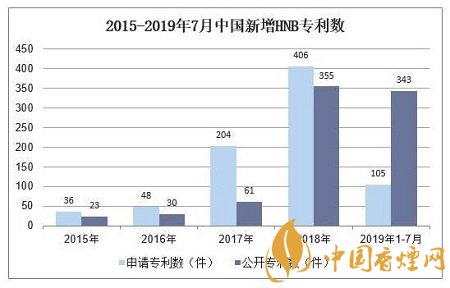 2016-2018年國內(nèi)HNB專利共計(jì)830件,其中2017年、2018年、2019年1-7月年新增HNB卷煙專利數(shù)(公開口徑)分別約為61件、355件、343件,技術(shù)推進(jìn)加快。