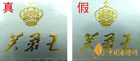 ①開蓋處“芙蓉王”及王冠圖案印刷:真品卷煙燙金定位準確,套色均勻,凹凸明顯,印刷工藝精細;假冒卷煙燙金定位不準,脫漆脫色嚴重,印刷工藝粗糙。
