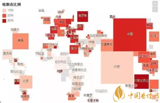 2016年,該國每天的煙草消費(fèi)者即吸煙者占15周歲以上人口的百分比。各國均被標(biāo)識(shí)為正方形,并可根據(jù)人口基數(shù)進(jìn)行縮放,以便您更直觀地了解各國吸煙人數(shù)。