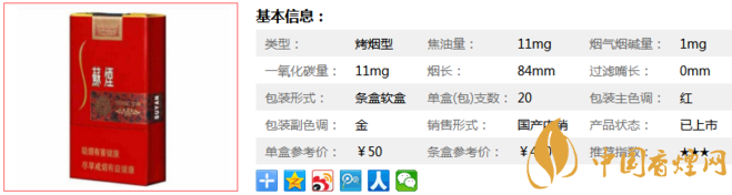 類型 :烤煙型 焦油量 :11mg 煙氣煙堿量 :1mg 一氧化碳量 :11mg