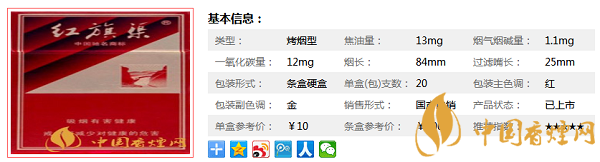 紅旗渠硬金紅一盒20支,煙長84mm,煙嘴長25mm,焦油量13mg,煙堿量1.1mg,一氧化碳量12mg,各地參考價格如下: