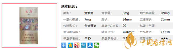 大唐是香港產(chǎn)的香煙,目前中國市場上面并不多。下面我們一起來看看它的參數(shù)信息。煙長84mm,焦油量8mg,煙堿量0.9mg,一氧化碳量7mg。
