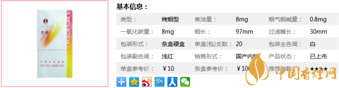 類型 :烤煙型 焦油量 :8mg 煙氣煙堿量 :0.8mg 一氧化碳量 :8mg