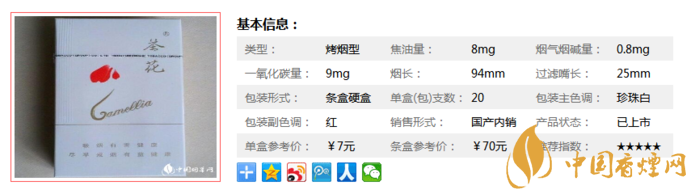 這款茶花煙比常規(guī)的煙稍微細一點,煙長94mm,比常見的細枝又粗了一點,相近的香煙還有嬌子X、釣魚臺藍景泰、中南海(5mg細枝)等,這款94mm的確實很耐抽,很實在的感覺。下面我們一起來看茶花94mm的參數信息:焦油量:8mg 煙堿量:0.8mg 一氧化碳量:9mg