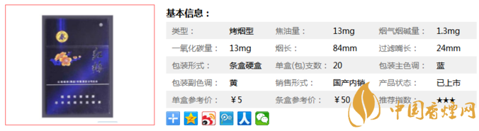 類型 :烤煙型 焦油量 :13mg 煙氣煙堿量 :1.1mg 一氧化碳量 :13mg
