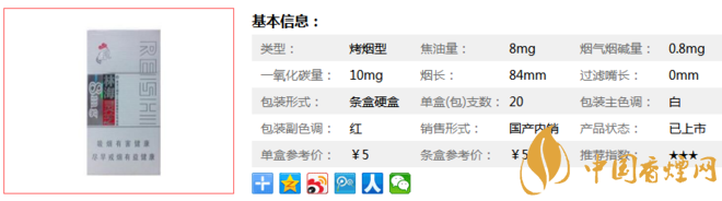 | 類型 :烤煙型 | 焦油量 :8mg | 煙氣煙堿量 :0.8mg | 一氧化碳量 :10mg |