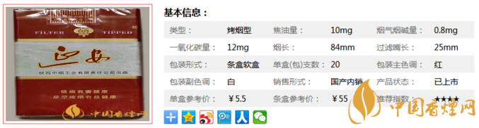 | 類型 :烤煙型 | 焦油量 :10mg | 煙氣煙堿量 :0.8mg | 一氧化碳量 :12mg |