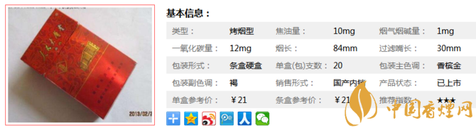 | 類(lèi)型 :烤煙型 | 焦油量 :10mg | 煙氣煙堿量 :1mg | 一氧化碳量 :12mg |