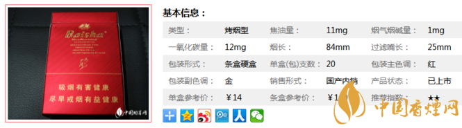 該產(chǎn)品選用醇化而具有獨特香氣的國內(nèi)外優(yōu)質(zhì)原料,輔于天然植物精華香精香料,依托紅塔集團技術中心雄厚的技術力量,運用當前業(yè)內(nèi)先進的生物減害制劑和激光打孔技術,突出“高科技、高香氣、低焦油、低危害”的風格特點。下面我們一起來看白沙尚品紅的參數(shù)信息:焦油量:11mg. 煙堿量:1mg. 一氧化碳量:12mg.