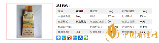 類型 :烤煙型 焦油量 :8mg 煙氣煙堿量 :0.8mg 一氧化碳量 :7mg