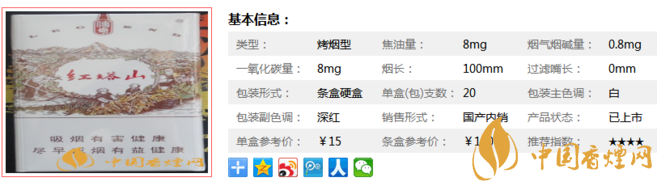 類型 :烤煙型 焦油量 :8mg 煙氣煙堿量 :0.8mg 一氧化碳量 :8mg