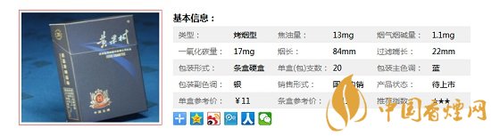 類型 :烤煙型 焦油量 :13mg 煙氣煙堿量 :1.1mg 一氧化碳量 :14mg