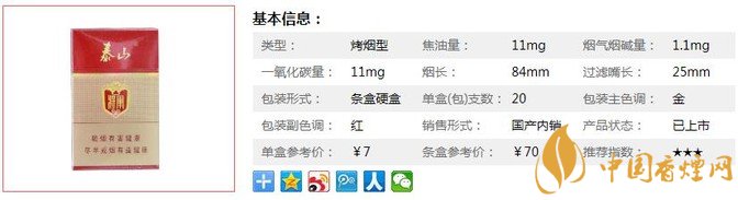 泰山紅將軍采用全新茶甜香技術(shù),融合泰山品牌全新茶甜香增香保潤技術(shù),茶香精華隨煙氣緩慢釋放,有效凈化吸食口感,全面降低口腔及喉部刺激感。下面我們一起來看泰山紅將軍的參數(shù)信息:焦油量:11mg. 煙堿量:1.1mg. 一氧化碳量:11mg.