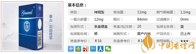 類型 :烤煙型 焦油量 :11mg 煙氣煙堿量 :1.1mg 一氧化碳量 :12mg