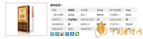 類型 :烤煙型 焦油量 :10mg 煙氣煙堿量 :0.1mg 一氧化碳量 :0.2mg