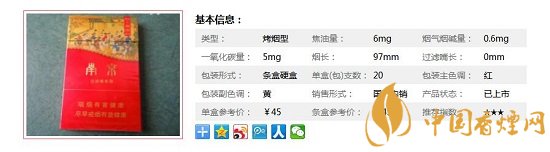 類型 :烤煙型 焦油量 :6mg 煙氣煙堿量 :0.6mg 一氧化碳量 :5mg