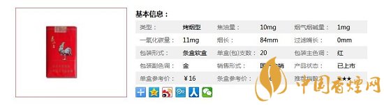 | 類型 :烤煙型 | 焦油量 :10mg | 煙氣煙堿量 :1mg | 一氧化碳量 :11mg |