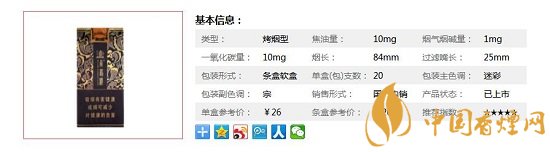 類型 :烤煙型 焦油量 :10mg 煙氣煙堿量 :1mg 一氧化碳量 :10mg