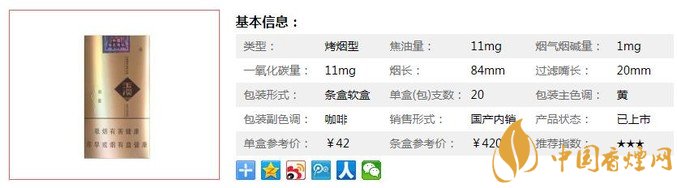 | 類型 :烤煙型 | 焦油量 :11mg | 煙氣煙堿量 :1mg | 一氧化碳量 :11mg |