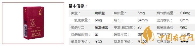 類型 :烤煙型 焦油量 :6mg 煙氣煙堿量 :0.6mg 一氧化碳量 :6mg