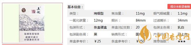 類型 :烤煙型 焦油量 :11mg 煙氣煙堿量 :1.1mg 一氧化碳量 :12mg