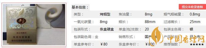類(lèi)型 :烤煙型 焦油量 :8mg 煙氣煙堿量 :0.8mg 一氧化碳量 :8mg