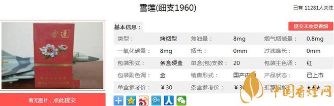 “雪蓮(細(xì)支1960) ”取名寓意為紀(jì)念新煙于1960年建廠,煙葉選料精良,突出煙草本香,增加抽吸的層次感和豐富性。雪蓮(細(xì)支1960)新品以過硬的質(zhì)量水平,3月份在新疆卷煙廠完成封箱工作,標(biāo)志該牌號(hào)卷煙正式落地新煙。經(jīng)香煙網(wǎng)小編市場(chǎng)調(diào)查雪蓮細(xì)支1960售價(jià)為30元/包。