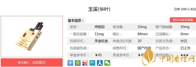 玉溪華葉用行業(yè)領(lǐng)先的頂級調(diào)香工藝精心鑄造,將自然本香發(fā)揮到極致,首創(chuàng)使用透明空腔爆珠濾棒技術(shù),使煙味可品,嘴棒可視,爆珠可觸,香氣可嗅,增加煙支的把玩性;同時使用香格里拉特產(chǎn)的雪山苷草,天然手法剔除苦味余下甘甜。經(jīng)香煙網(wǎng)小編市場調(diào)查玉溪華葉售價為45元/包。