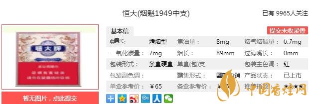 恒大煙魁1949中支煙支長89mm,煙支周長介于細支煙和常規(guī)煙之間,在吸味和滿足感上做到了均衡和統(tǒng)一。下面我們一起來看恒大煙魁1949中支的參數(shù)信息:焦油量:8mg 煙堿量:0.7mg 一氧化碳量:7mg