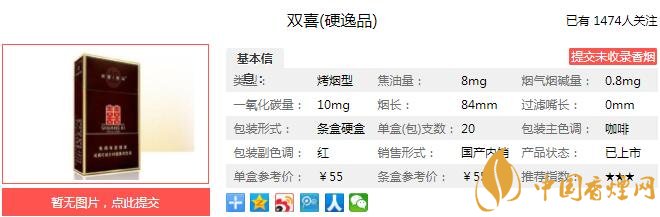 雙喜硬逸品煙支長84mm,過濾嘴長25mm,外置溝槽加草本植物顆粒的濾嘴棒,煙支散發(fā)著醇化酒香與蜜餞甜香,非常誘人。下面我們一起來看雙喜硬逸品的參數(shù)信息:焦油量:8mg 煙堿量:0.8mg 一氧化碳量:10mg