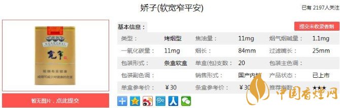綜合來說嬌子(寬窄平安)的質(zhì)量還是可以保證的。它有著寬窄系列香煙傳統(tǒng)的口感和味道,細(xì)膩而香醇。只是相比其它款式的寬窄,在某一品評指標(biāo)上,稍有些差距。但是橫向比對相同價位其它品牌的香煙,平安的優(yōu)勢,還是存在的,售價在30元一包。
