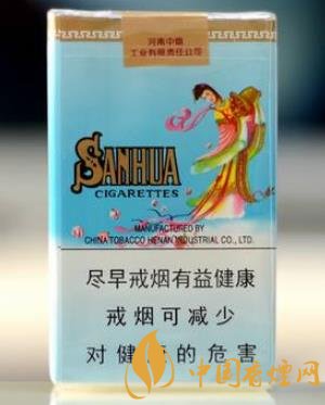 煙盒正面包裝以藍(lán)天白云為背景,從藍(lán)天灑下朵朵紅花,背面一位婀娜多姿的古代美女輕盈的站在白云之上,從花籃中灑下美麗的花朵,寓意著給民間帶來風(fēng)調(diào)雨順,國(guó)泰民安,與正背面金色的散花漢字以及SANHUA漢語拼音共同構(gòu)成了一幅美麗的賞心悅目的畫面。