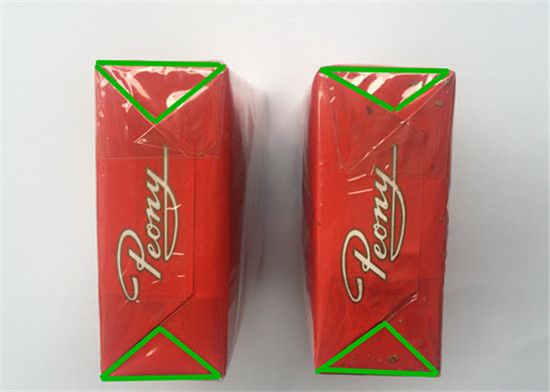 牡丹香煙(軟)真假鑒別圖中可以發(fā)現(xiàn)真煙底部折痕形狀規(guī)則,為對(duì)稱(chēng)的等腰三角形;而假煙的底部三角形折痕形狀不規(guī)則,而且不對(duì)稱(chēng)。