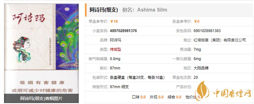 阿詩(shī)瑪(細(xì)支)香煙價(jià)格表圖