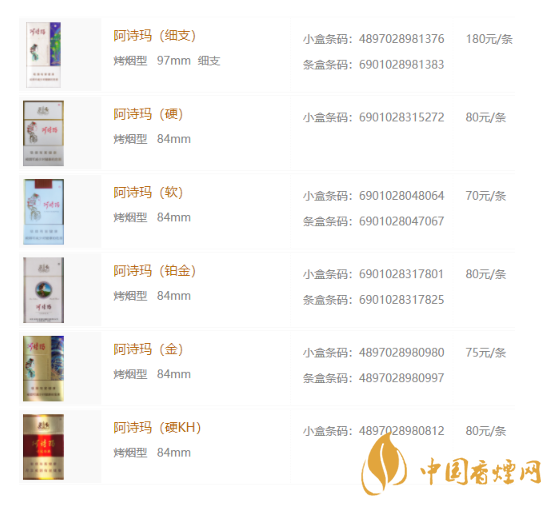 2020年阿詩瑪香煙價(jià)格表圖
