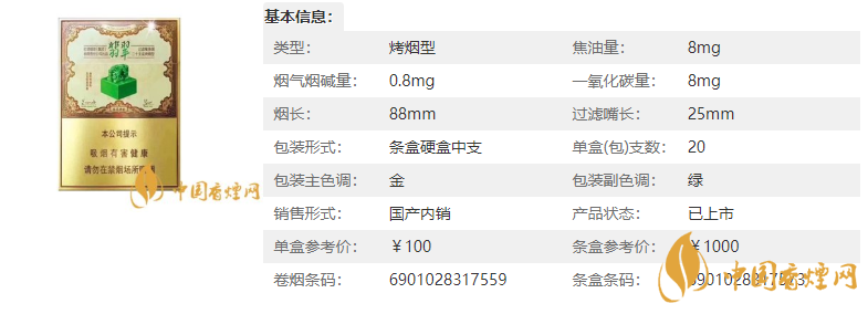 | 類型 :烤煙型 | 焦油量 :8mg | 煙氣煙堿量 :0.8mg | 一氧化碳量 :8mg |