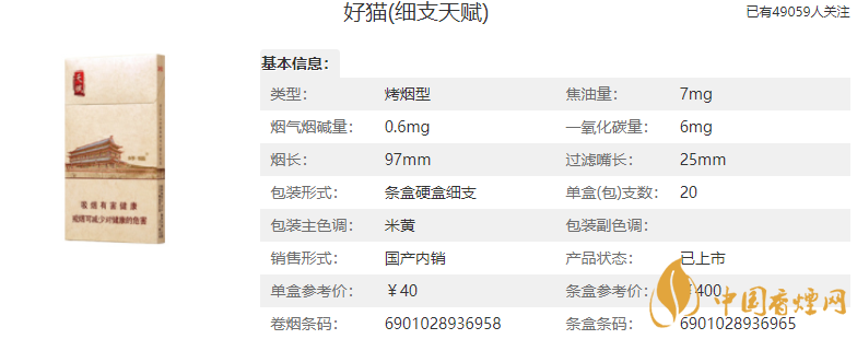 好貓(細(xì)支天賦)卷煙濾嘴中新增功能性增香保潤(rùn)線,具有增香、增潤(rùn)功能,可使煙氣潤(rùn)感增加,煙香更加透發(fā)、柔順,以充分滿足消費(fèi)者低焦吸食需求。據(jù)香煙網(wǎng)小編了解到,好貓細(xì)支天賦香煙參考價(jià):40元/盒。