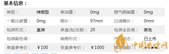 煙長(zhǎng):97mm 過濾嘴長(zhǎng):25mm 包裝形式:條盒硬盒細(xì)支 單盒(包)支數(shù):20