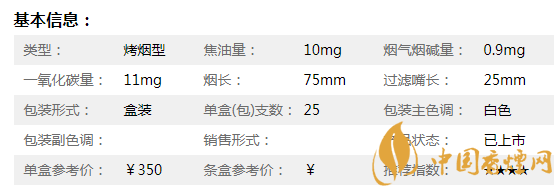 | 類(lèi)型 :烤煙型 | 焦油量 :11mg | 煙氣煙堿量 :1mg | 一氧化碳量 :13mg |