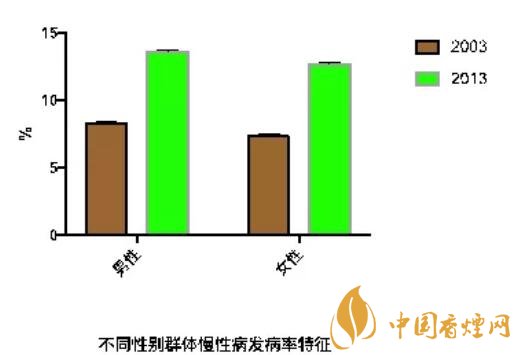 進(jìn)一步,作者對(duì)吸煙相關(guān)的慢性病發(fā)病情況進(jìn)行了分析,結(jié)果顯示:從2003年到2013年,女性群體慢性病的發(fā)病率從8.3%上升到了13.6%。男性群體發(fā)病率則從7.3%上升到了12.7%。其中,吸煙群體的發(fā)病率顯著高于不吸煙的群體。而吸煙開(kāi)始時(shí)間越早,則發(fā)病率越高。支氣管癌、肺癌以及牙病的發(fā)病率在吸煙群體中比例較高。而類(lèi)風(fēng)濕性關(guān)節(jié)炎與心臟病的發(fā)生率則較低。長(zhǎng)期來(lái)看,吸煙引發(fā)的最主要的疾病為消化系統(tǒng)癌癥、慢性阻塞性肺病(COPD)以及腦血管疾病。