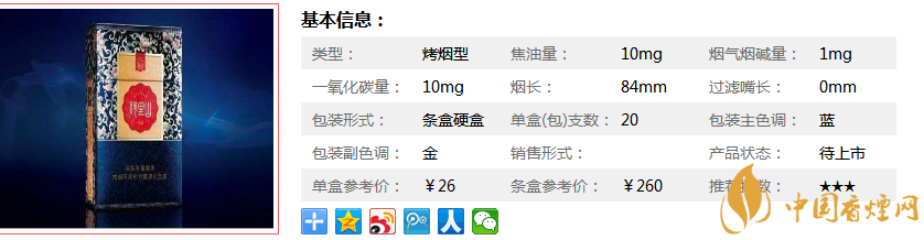 類型 :烤煙型 焦油量 :10mg 煙氣煙堿量 :1mg 一氧化碳量 :10mg