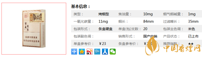 | 類型 :烤煙型 | 焦油量 :10mg | 煙氣煙堿量 :1mg | 一氧化碳量 :11mg |