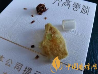 一小段材質(zhì)較硬的過(guò)濾嘴。海綿體內(nèi)包裹著的,是一顆淡綠色的香珠。同時(shí),過(guò)濾嘴紙張內(nèi),附著一層黃色的紙張??傊?,過(guò)濾嘴里內(nèi)容豐富的很。