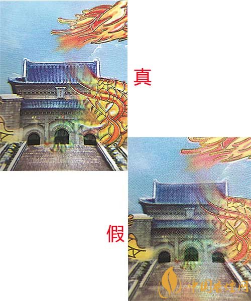 真煙小盒正面天空波浪紋、中山陵屋頂瓦片清晰連貫;假煙小盒正面天空波浪紋、中山陵屋頂瓦片模糊不清,時(shí)有時(shí)無(wú)。