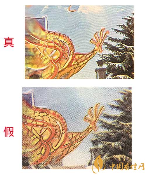 真煙小盒正面龍紋和松枝印刷清晰,色彩飽和度高,有立體感;假煙小盒正面龍紋和松枝印刷模糊,無(wú)立體感,且有粗糙圓形圖案。