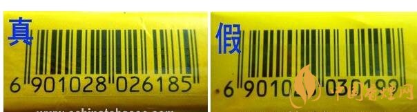 真品小盒條形碼字體和條形碼邊緣均為明顯的鋸齒狀,字體較細??;假煙則無真品特征,而且字體較粗。