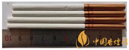 真品卷煙:煙支長度為100mm,濾嘴處有四排激光預(yù)打孔,打孔透氣度好。卷煙紙顏色白,手摸煙支飽滿緊實,搭扣處結(jié)合完美。煙絲呈現(xiàn)絲條狀,色澤基本一致。