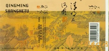 上世紀(jì)80年代,開封卷煙廠出品的“宋城”煙標(biāo),則采用廣闊的全景畫表現(xiàn)形式,選取了該畫作的后半部分:只見(jiàn)高大的城樓兩側(cè)的屋宇鱗次櫛比,街市行人摩肩接踵;士農(nóng)工商、男女老幼、三教九流,無(wú)所不備。